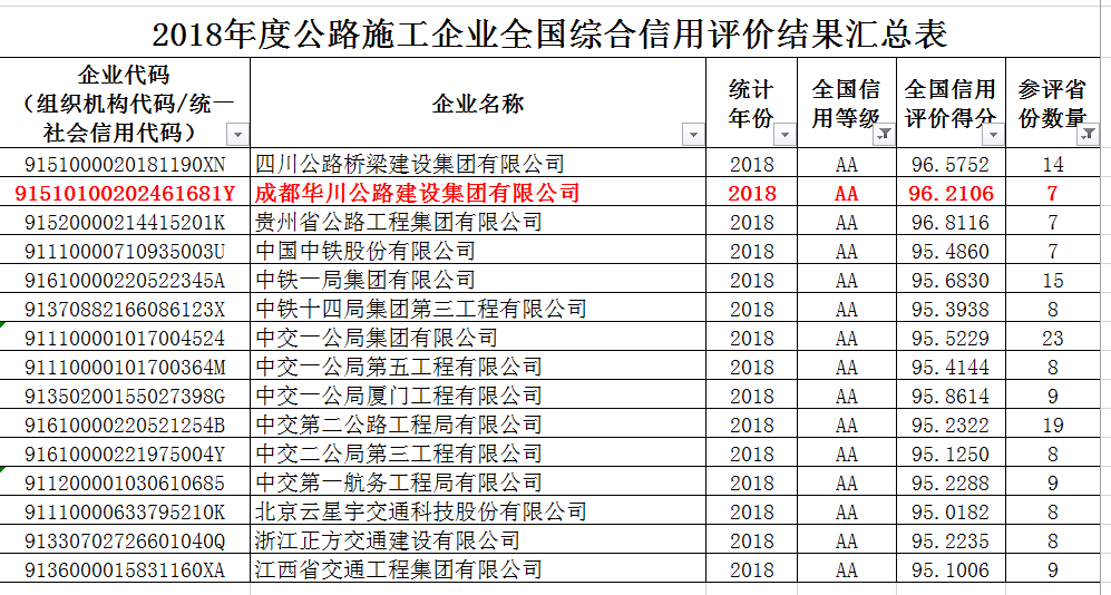 交通運輸部于2019年6月26日上午對2018年度公路施工企業全國綜合信用評價結果進行公示,集團公司榮獲 “AA”級。