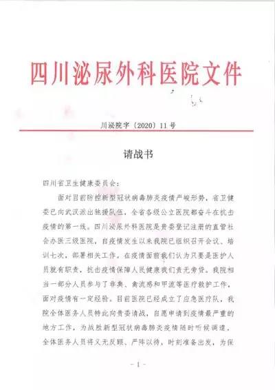1月28日集團(tuán)旗下四川省泌尿外科醫(yī)院黨政工群各級(jí)領(lǐng)導(dǎo)干部、防控應(yīng)急醫(yī)療隊(duì)和醫(yī)院技術(shù)骨干100余人召開請(qǐng)戰(zhàn)大會(huì),主動(dòng)向省衛(wèi)健委請(qǐng)戰(zhàn)馳援武漢,請(qǐng)戰(zhàn)書已于當(dāng)日送達(dá),省衛(wèi)健委對(duì)醫(yī)護(hù)人員積極抗擊疫情給予肯定贊揚(yáng),并指示爭(zhēng)取第三批次派遣醫(yī)護(hù)人員前往疫區(qū)第一線。1月31日起,該院根據(jù)省中醫(yī)管理局公布的冬春季呼吸道傳染病預(yù)防建議處方,緊急熬制中藥湯劑,免費(fèi)向市民發(fā)放,每天限量供應(yīng)1000人份(6000袋)。