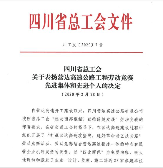 近日,營達高速公路建設勞動競賽得到四川省總工會的表揚,集團董事長謝應文等先進個人和集體獲省“五一勞動獎章”、“五一勞動獎狀”、“工人先鋒號”等獎勵。