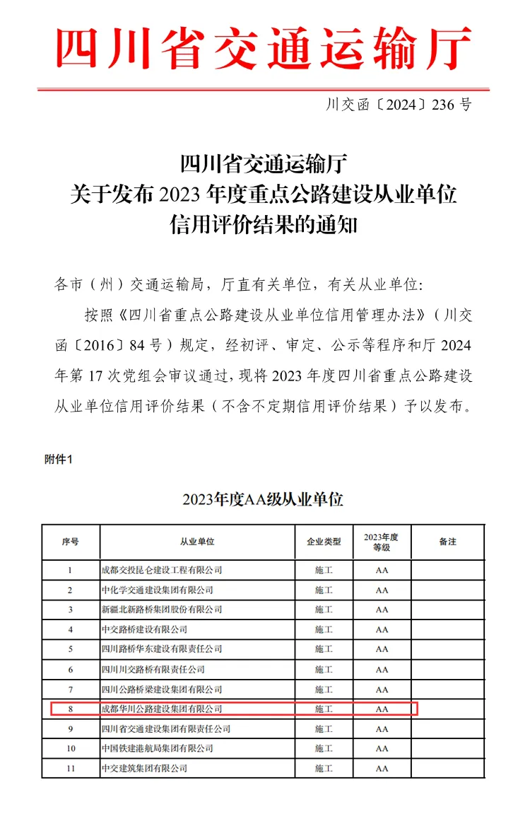集團(tuán)榮獲四川省重點公路建設(shè)從業(yè)單位2023年度信用評價“AA”等級