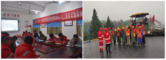 本次試驗段鋪筑在K48+570-K48+940,全長370m。為了成功完成試驗段鋪筑工作,項目部精心組織,科學籌劃,專門成立試驗段鋪筑管理小組,細化施工方案,明確人員分工。提前召開施工技術交底會,班前安全教育,從攤鋪、碾壓、運輸車輛運輸、施工溫度控制、人員組織等各個方面詳細交代,確保試驗段一次性成功鋪筑。